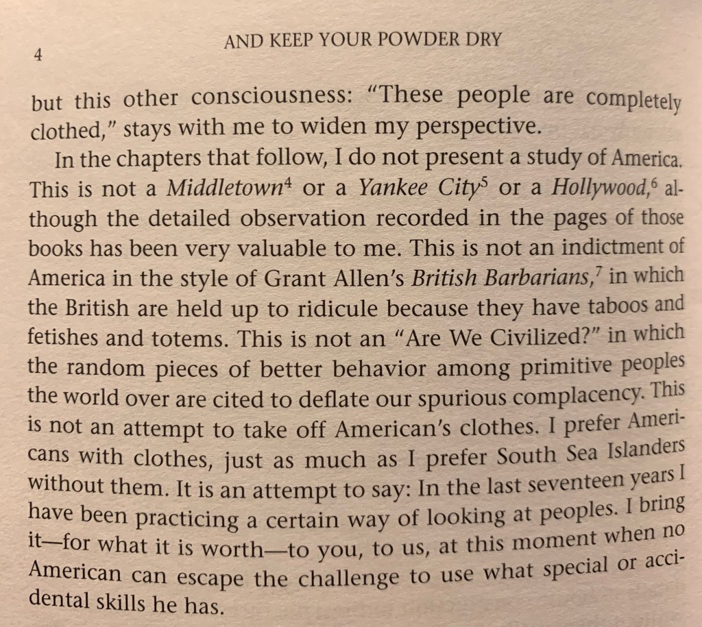 Chapter I is “The Introduction” of And Keep Your Powder Dry as written in 1942. On page 2, Margaret Mead writes: