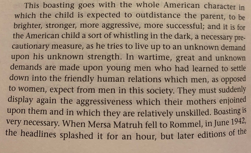 I absolutely adore the characterization of the American child’s attempt to impress their parents as a “whistling in the dark” (2000). I think most American kids, especially very young ones and young adult ones, would completely relate to trying to “…live up to an unknown demand upon [their] unknown strength” (2000). This is a thread that weaves through And Keep Your Powder Dry—Americans are always bracing for the unknown and unimagined. We are always moving on, always hopeful of moving up.
