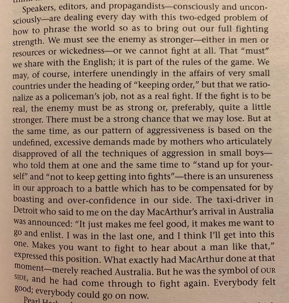She wants us now to consider our place in the world. She does not know the future as we do; she is focused on the events of her day. Hitler is the clear enemy, a tyrant who threw the whole world into despair. For America in 1942, fascism was the undeniable enemy. Mead wanted Americans to understand that we were, because of our national character, completely at odds in our values to fascism and also highly susceptible to it.