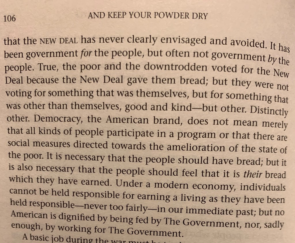 So, it does mean that there should be measures to alleviate poverty. That is just not all it means, in a way that made the New Deal dangerous in her estimation. The American brand means you earn your bread, and not from the government (because the government is the parent, remember, and adult Americans move on from their parents). She presents these ideas so clearly as part of the same character structure that I thought she might be surprised how polarized those values are in American politics today, when they are not often seen as two integral parts of a whole, but as mutually exclusive ideas with each side needing to believe they are right.