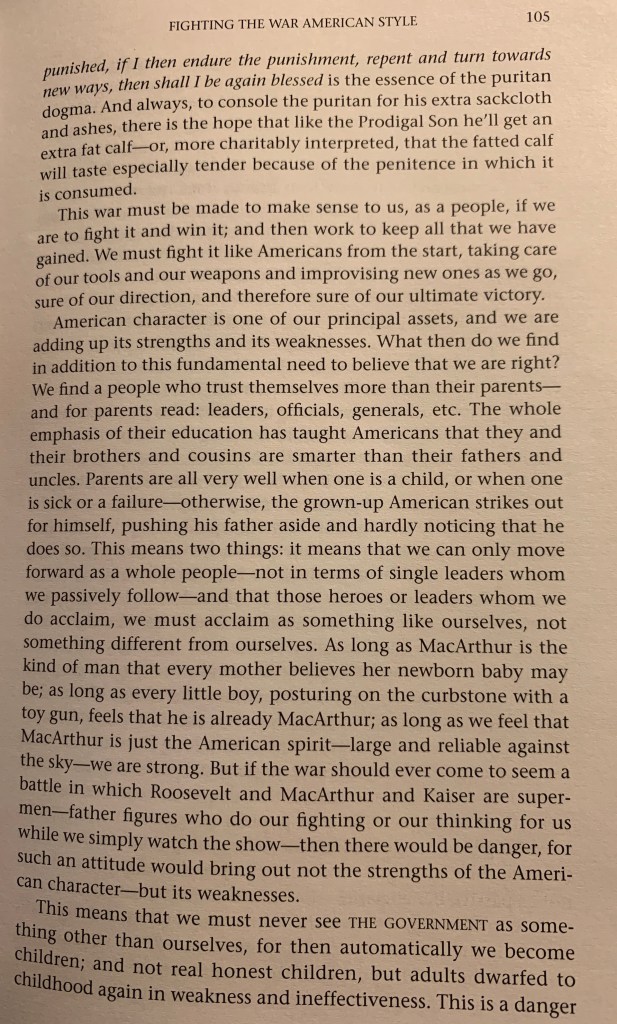 In Chapter X, “Fighting the War American Style,” Mead takes the ideas she’s been developing throughout And Keep Your Powder Dry, and attempts to explain that an understanding of the American Character allows us to accurately assess our strengths and weaknesses, which were (and are) not the strengths and weaknesses of our enemies or our allies. She is talking about America, an undeniable nation of immigrants, to Americans, with a deliberate purpose in mind.