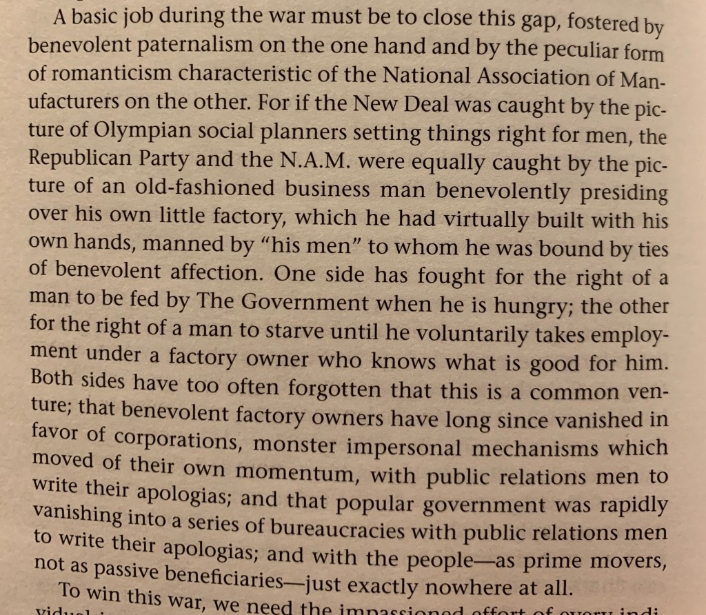 Both sides have too often forgotten that this is a common venture; that benevolent factory owners have long since vanished in favor of corporations…with public relations men to write their apologias; and that popular government was rapidly vanishing into a series of bureaucracies with public relations men to write their apologias; and with the people—as prime movers, not as passive beneficiaries—just exactly nowhere at all.