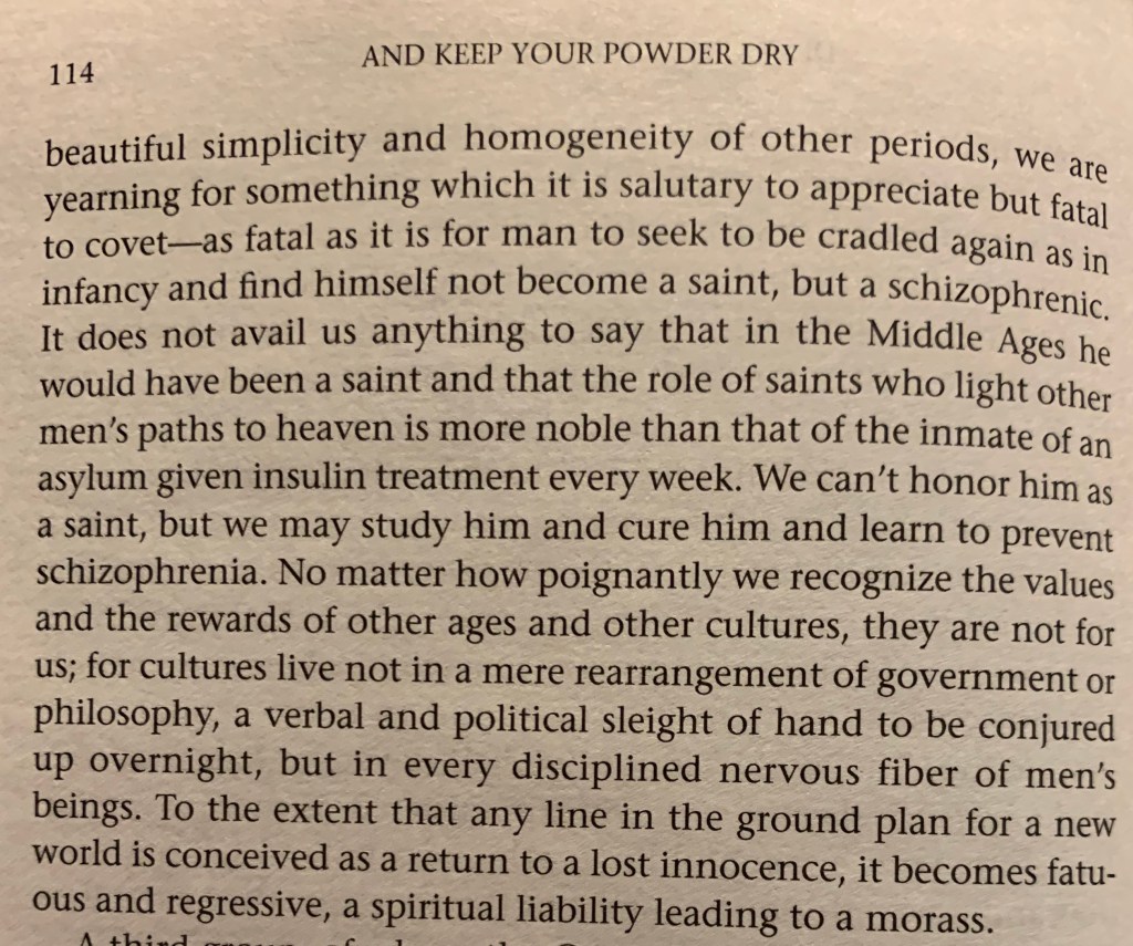 No matter how poignantly we recognize the values and the rewards of other ages and other cultures, they are not for us; for cultures live not in a mere arrangement of government or philosophy…but in every disciplined nervous fiber of men’s beings.”