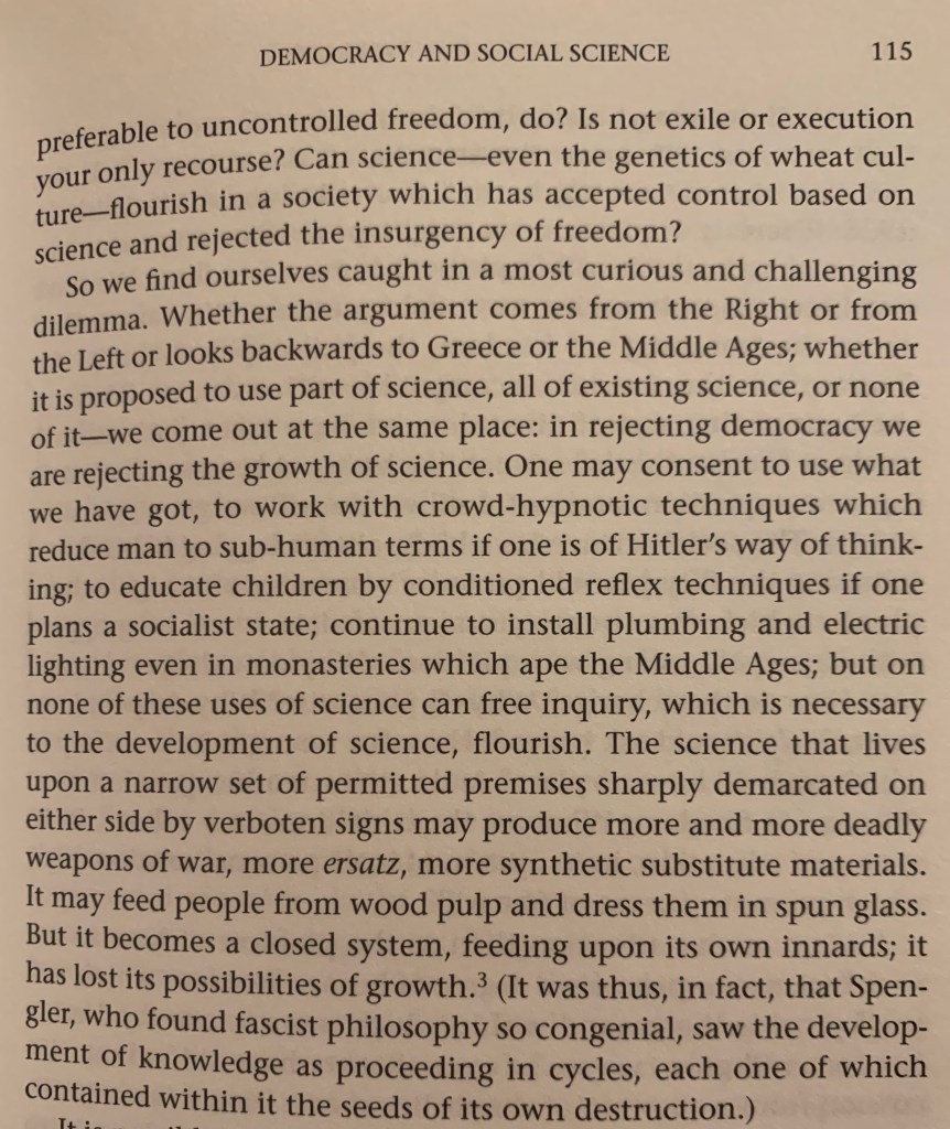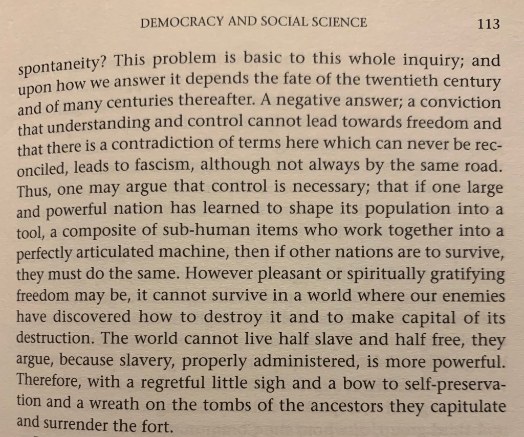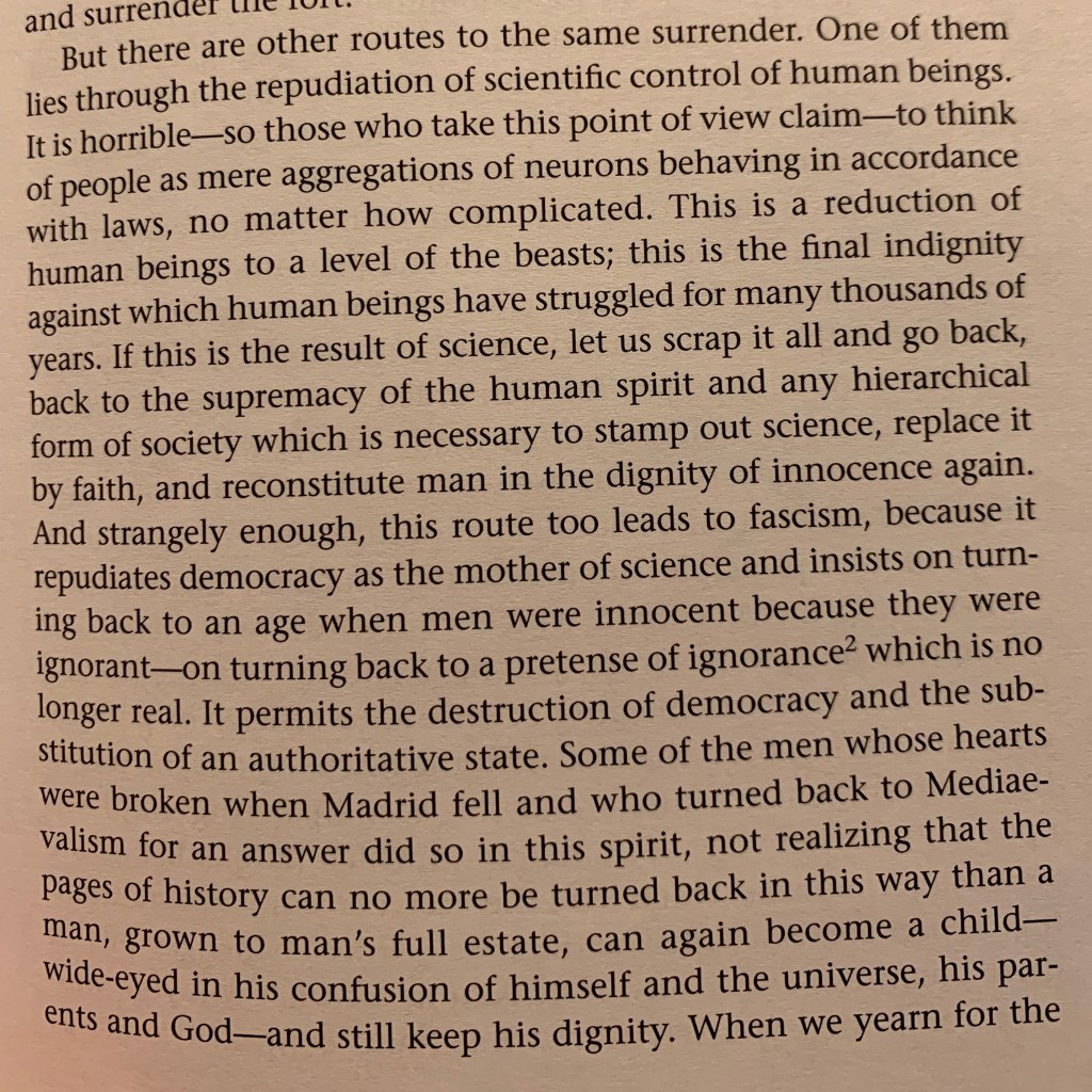 I feel like I could chew on that all day and still not quite understand what she is saying here. This is what I’m reading… if you are convinced that the understanding and control science allows inevitably leads to a loss of freedom when applied to people, you will find your way to fascism one way or another.