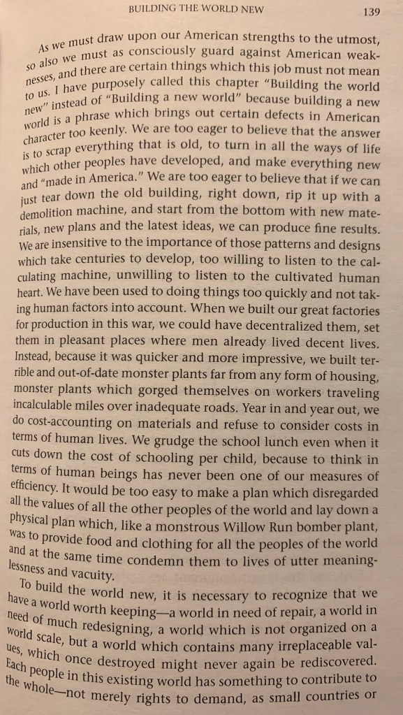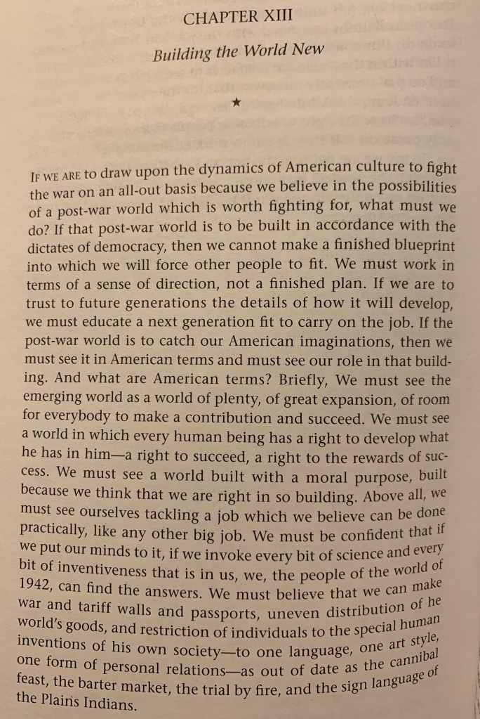 “Building the World New” is the title of Chapter XIII. We exist beyond her imaginings in 1942. Characteristically, though, for not knowing our world, she sure knows us very well.