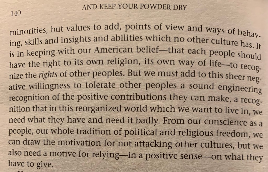 “But we must add to this sheer negative willingness to tolerate other peoples a sound engineering recognition of the positive contributions they can make, a recognition that in this reorganized world which we want to live in, we need what they have and we need it badly.”