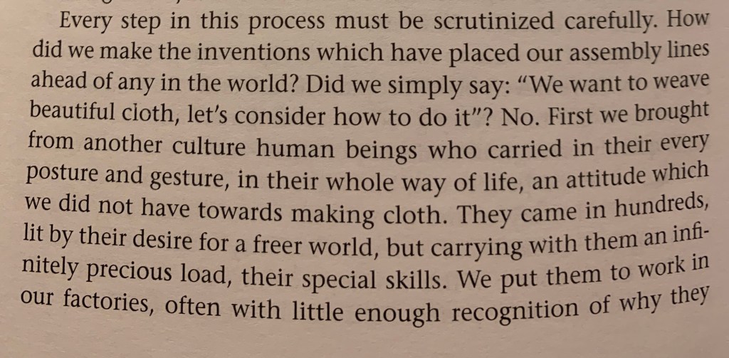 She expounds upon the importance of immigrants to helping us build the factories that defined the America of her time. We did not build machines that successfully made clothes through sheer imagination.