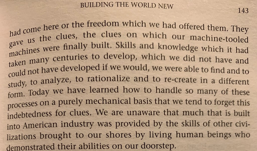 “We are unaware that much that is built into American industry was provided by the skills of other civilizations brought to our shores by living human beings who demonstrated their abilities on our doorstep.”