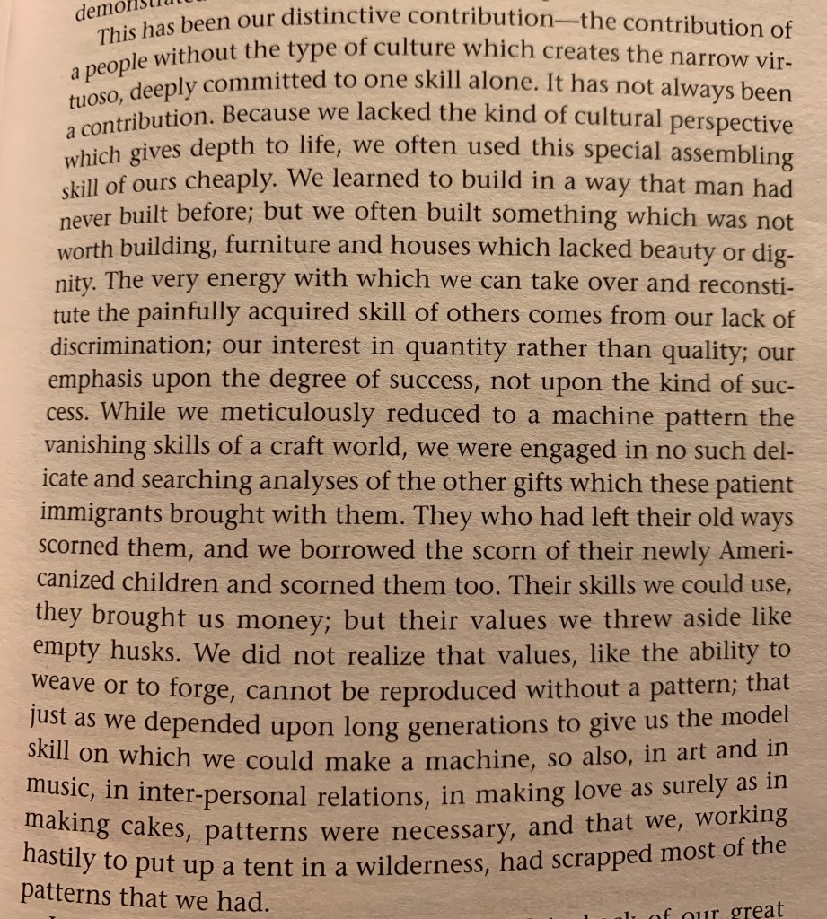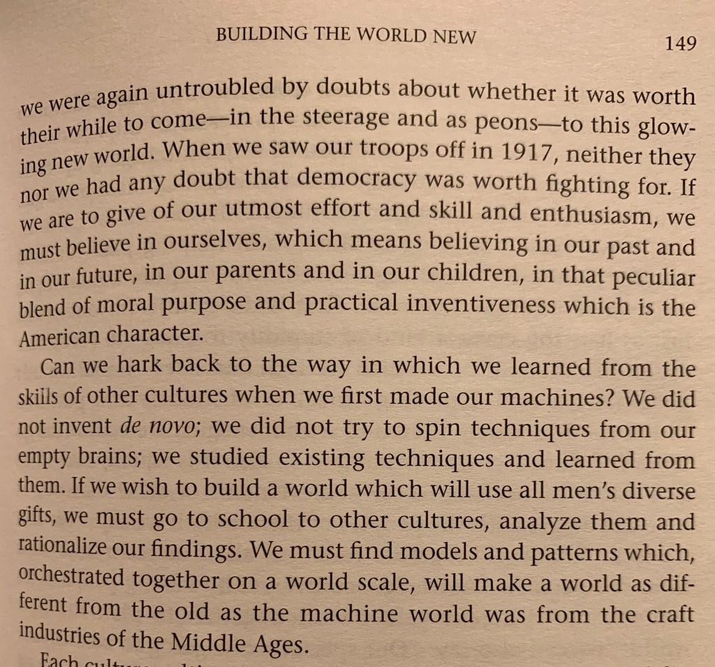 “We are too eager to believe that the answer is to scrap everything that is old, to turn in all the ways of life which other peoples have developed, and make everything new and ‘made in America.’”