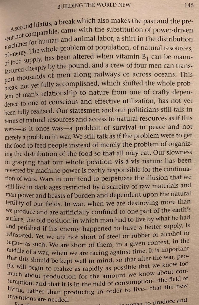 “Wars in turn tend to perpetuate the illusion that we still live in dark ages restricted by a scarcity of raw materials and man power and beasts of burden and dependent upon the natural fertility of our fields.”