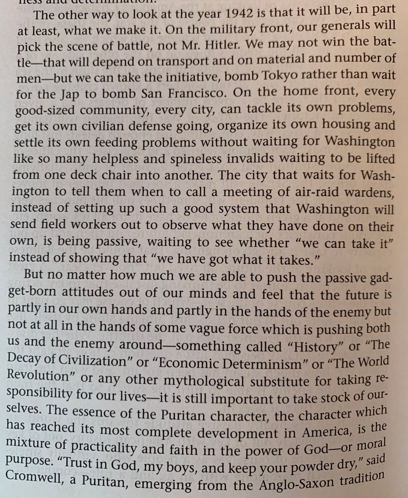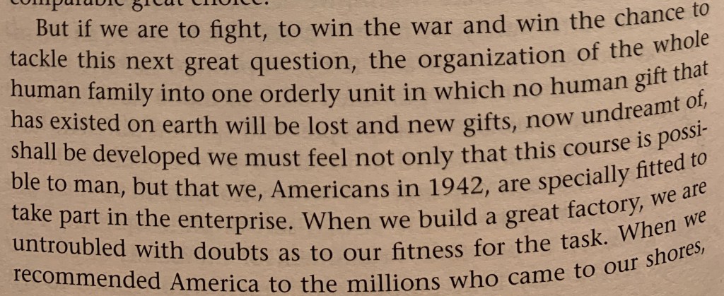 “…we must feel not only that this course is possible to man, but that we, Americans in 1942, are specially fitted to take part in the enterprise.”