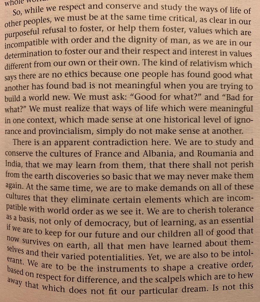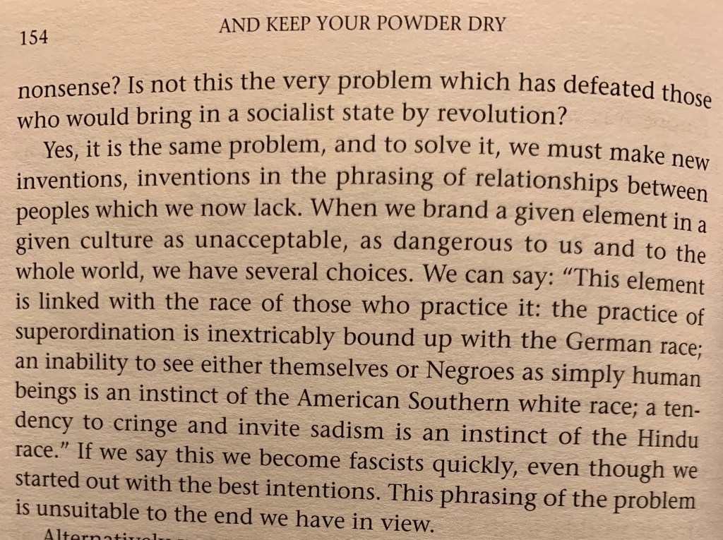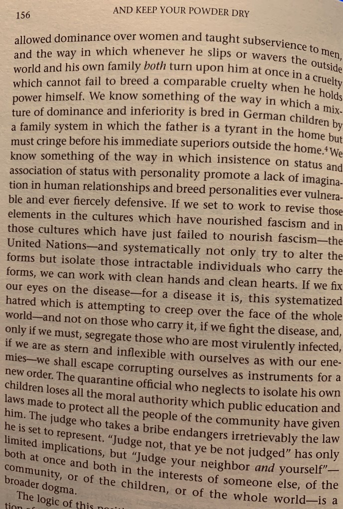 Chapter XI is titled “Are Democracy and Social Science Compatible Each with Each?” Here, Margaret Mead talks specifically about social engineering, what it means in terms of what she is doing with And Keep Your Powder Dry, and the criticism she has received or knows she will. She answers the criticism mostly by showing that she’s thought a great deal about the question: mustn’t this road of assessing people scientifically and using their strengths as tools lead to fascism, the very thing we were fighting against?