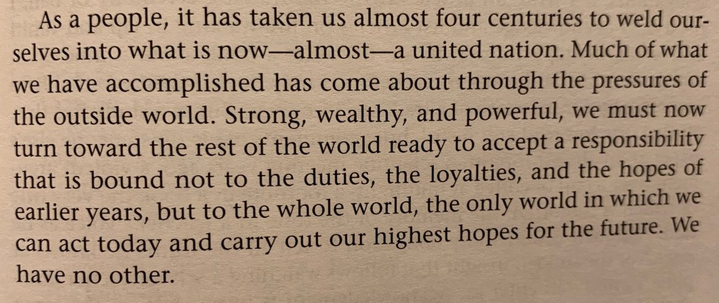 “Strong, wealthy, and powerful, we must now turn toward the rest of the world ready to accept a responsibility that is bound not to the duties, the loyalties, and the hopes of earlier years, but to the whole world, the only world in which we can act today and carry out our highest hopes for the future. We have no other.”