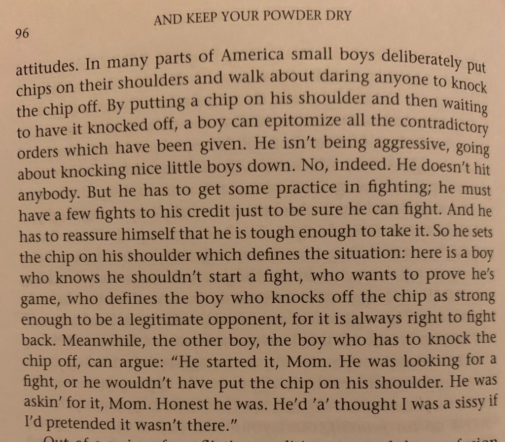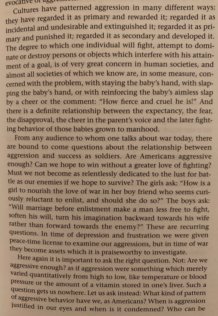 “The Chip in the Shoulder” is Chapter IX of And Keep Your Powder Dry by Margaret Mead. This chapter is where Mead begins to turn her attention to World War II. That is not why it proves to be one of the saddest to me. It is because I am not sure she’d even recognize us anymore when she talks about aggression. At the same time, there are moments when we are still very recognizable.