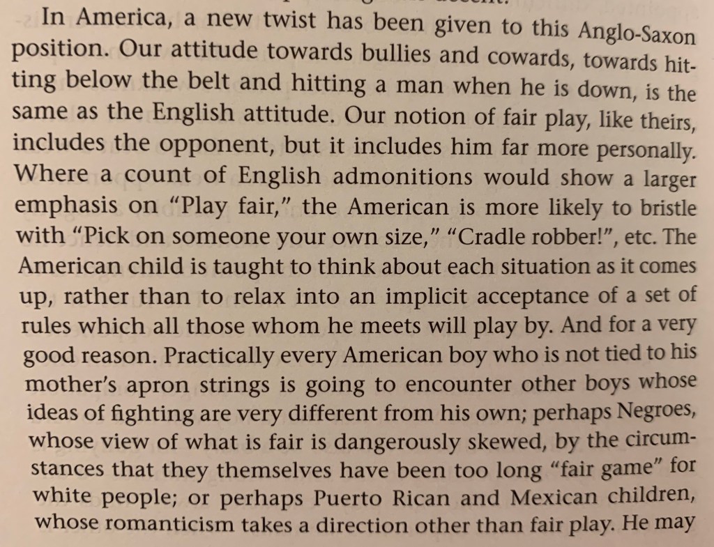 I wonder again: are we far from where we were, or did Mead miss the severity of the exception she saw to fair play? She espouses the idea that Americans don’t fight until they are pushed to fight, despite the lynchings happening around her. She has the knowledge and wherewithal to acknowledge that black people were fair game for white people and that had dangerous ramifications, but there was not yet the realization that the whole time that white Americans were giving white Americans permission to see black Americans as fair game, they were giving Americans permission to see Americans as fair game.