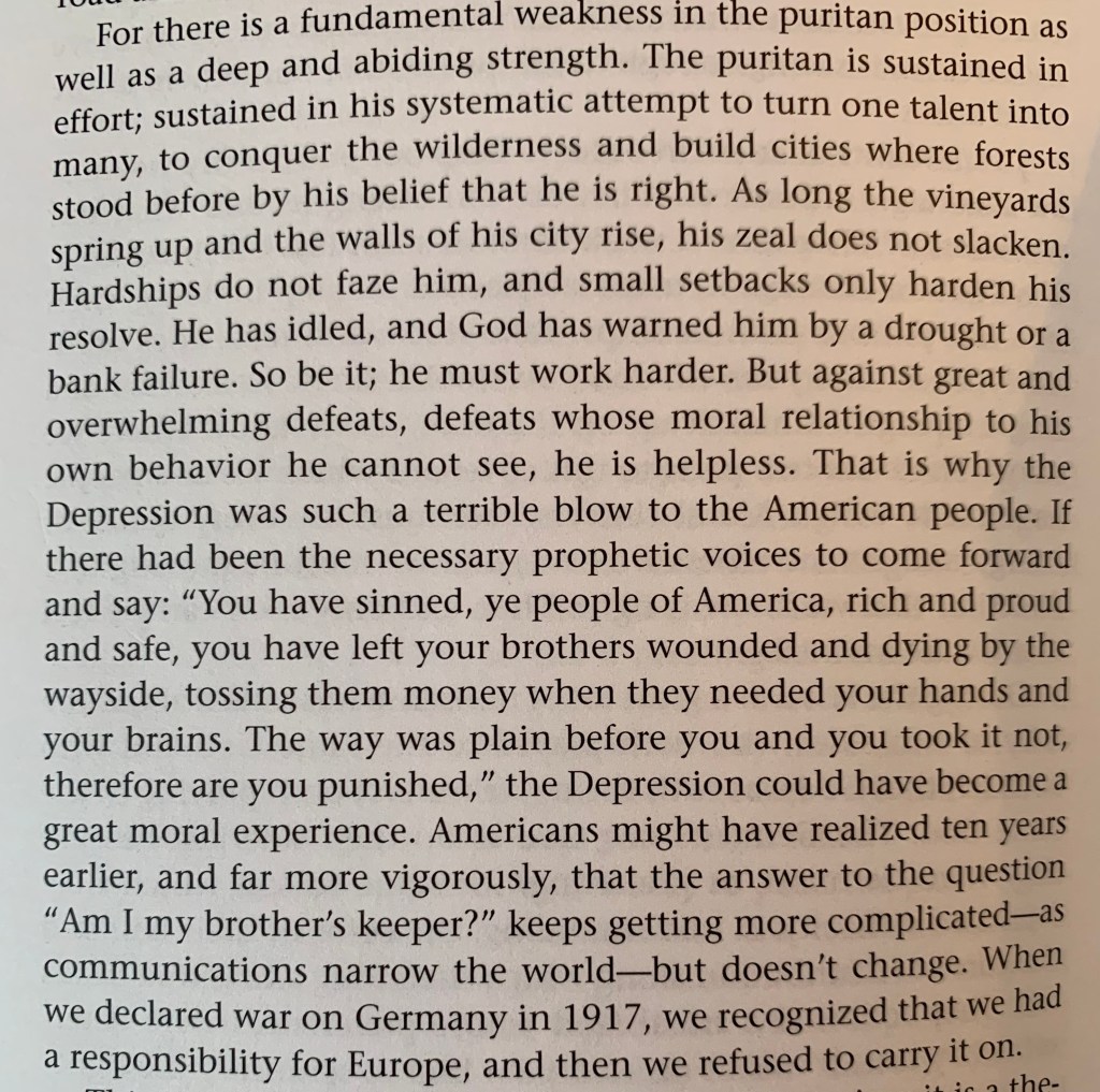 I interpret this is as Mead saying Americans believe that our success and progress is a result of our effort, and our failures are a signal that we must do better. Some things, like the Great Depression, really undo that, because our personal trials have got exactly nothing to do with our personal efforts. She is saying, as I read it, that when that happens, we need to see it as a national failure and the nation needs to do better—that even if it’s not true that what is hurting us is our punishment for doing some wrong, we still need the moral experience of taking responsibility for it to move on.