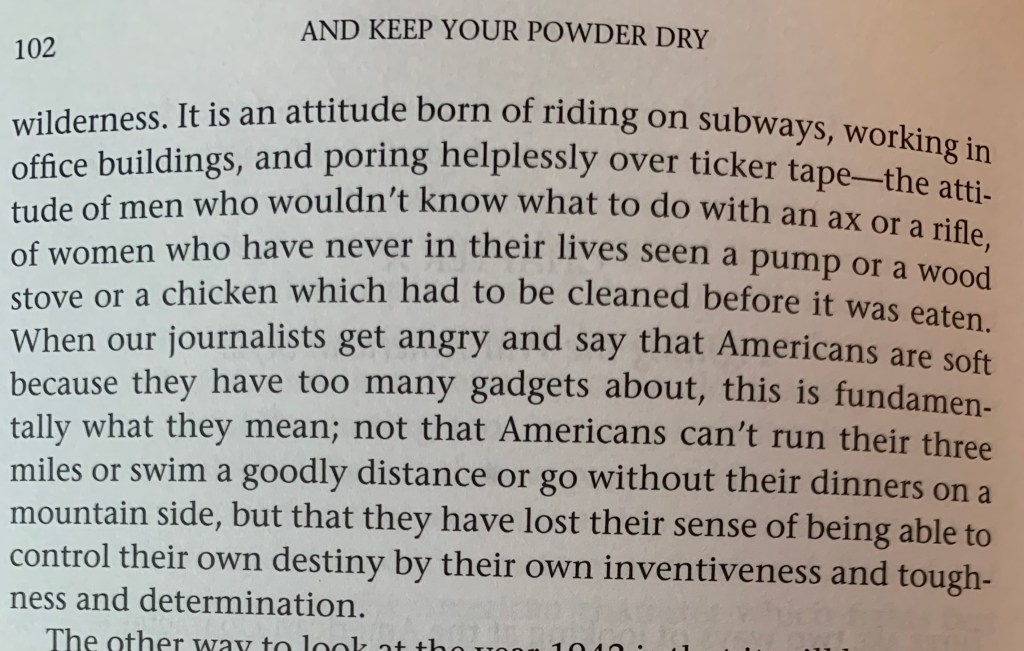 “When our journalists get angry and say that Americans are soft because they have too many gadgets about, this is fundamentally what they mean…that they have lost their sense of being able to control their own destiny by their own inventiveness and determination.”
