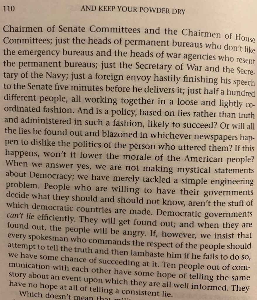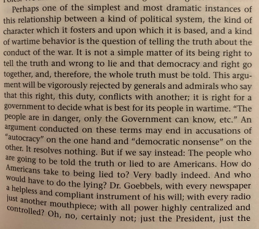 She asserts that democracy and truth-telling go together, because democracy, particularly the American brand, needs to believe there is a right way forward. In a previous blog, we read as she carefully built the case that we, individually and collectively, should be striving to always do right, punishing ourselves when we fail, and then working to do better. As I understand it, she is arguing that that work is fundamental to who we are as a people. Now, she extends that to the practices of the government, and what it means for how our leaders should conduct themselves in wartime. She comes to the conclusion that telling the truth, as quickly as possible, is most in line with the American character, as built from the family up.