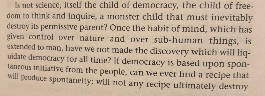 “Once the habit of mind, which has given control over nature and over sub-human things, is extended to man, have we not made the discovery which will liquidate democracy for all time?”