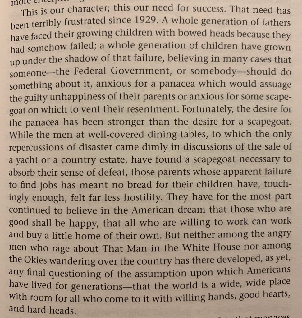 She says that the rich men of her time found a scapegoat when times got hard, but Americans who lost everything in the Great Depression or the Dust Bowl didn’t fall victim to the same hostility. Average Americans, she maintained, still believed that if you were good and worked hard, you could build a happy life for yourself.