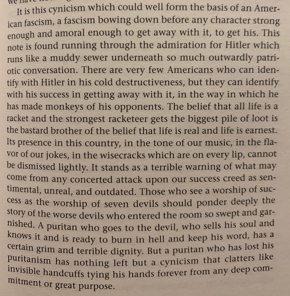 “It is this cynicism which could well form the basis of an American fascism, a fascism bowing down before any character strong enough and amoral enough to get away with it, to get his.”