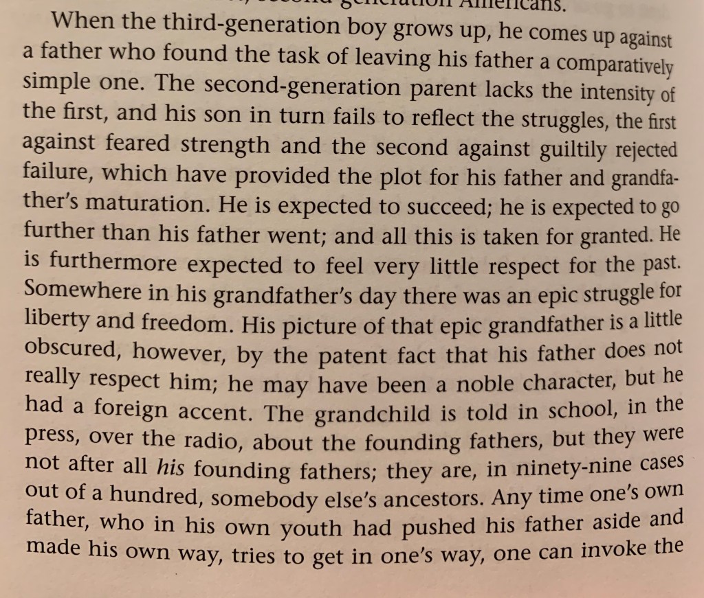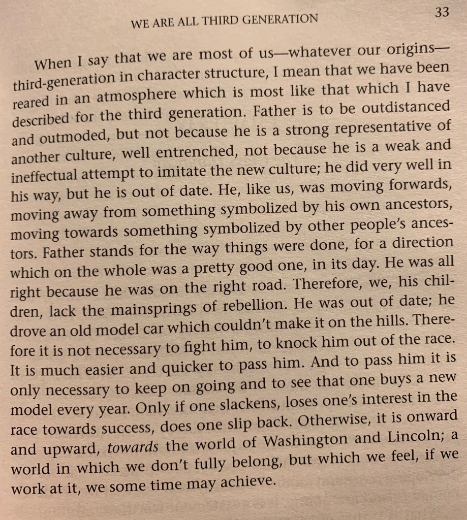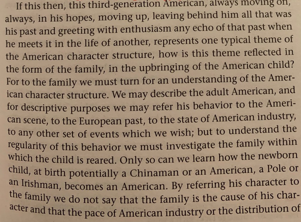 “…this third-generation American, always moving on, always, in his hopes, moving up, leaving behind him all that was his past and greeting with enthusiasm any echo of that past when he meets in the life of another, represents one typical theme of the American character structure…”
