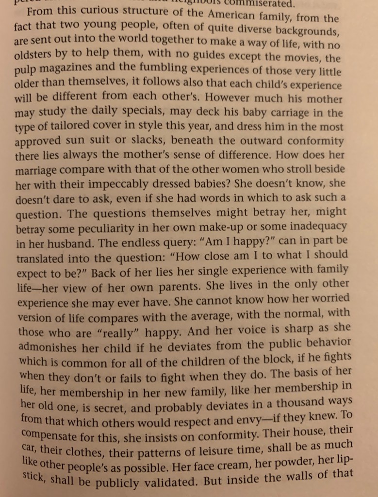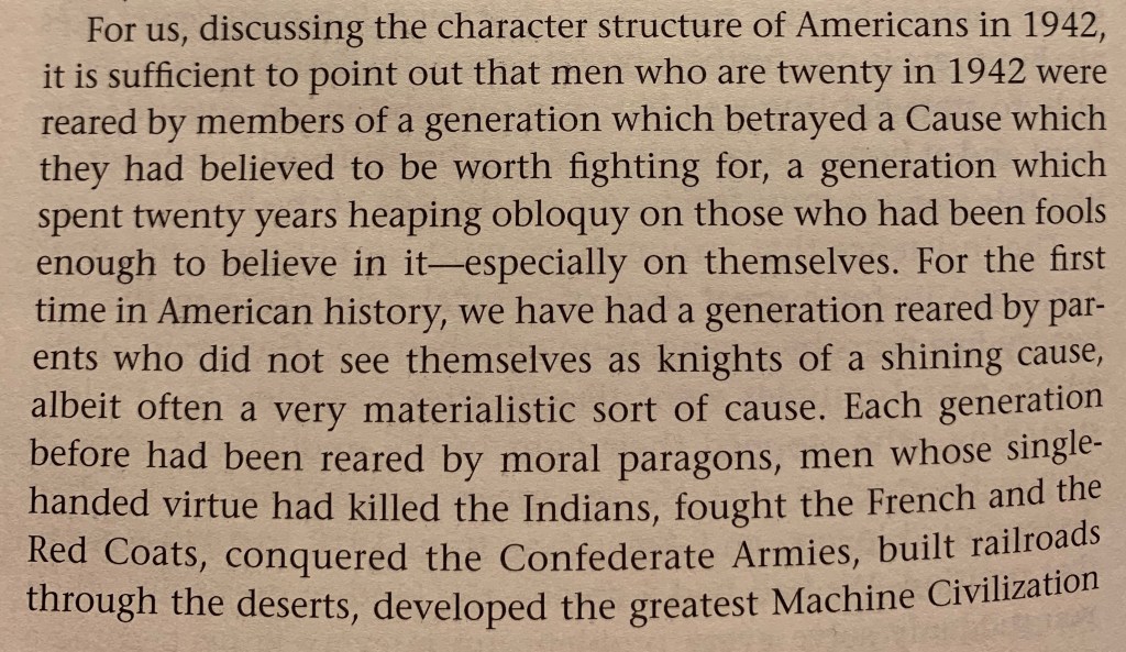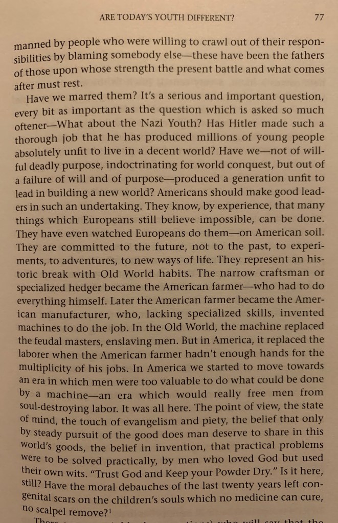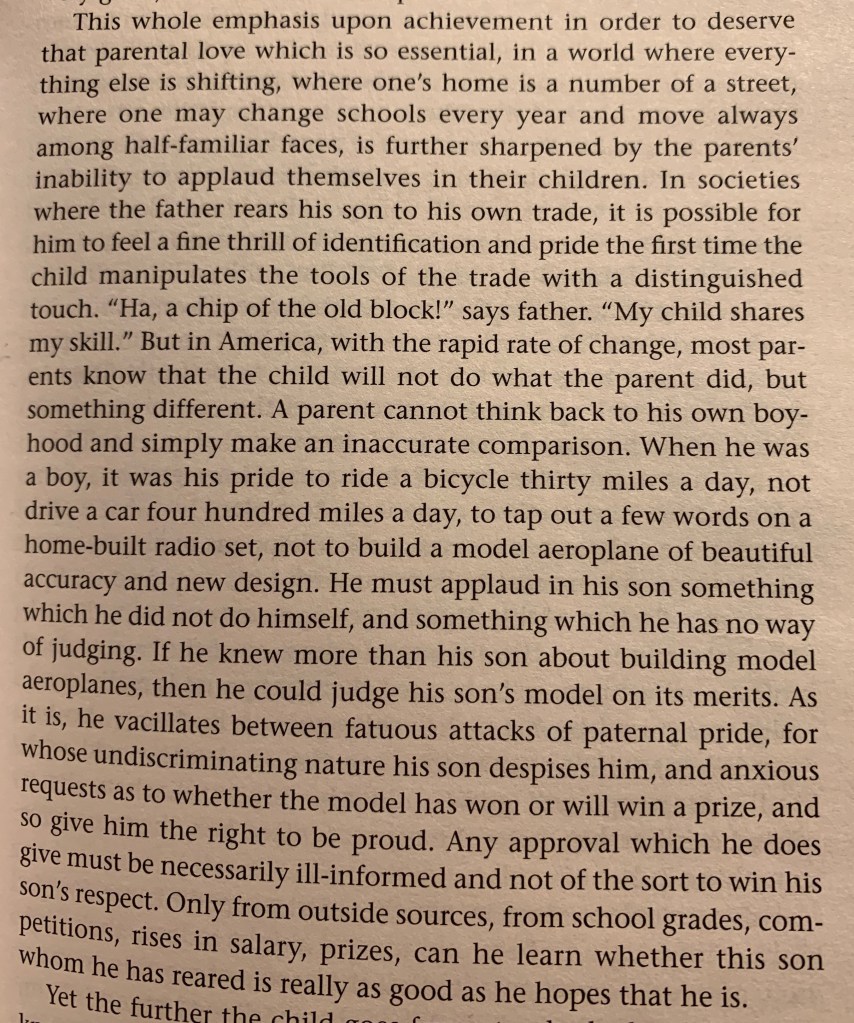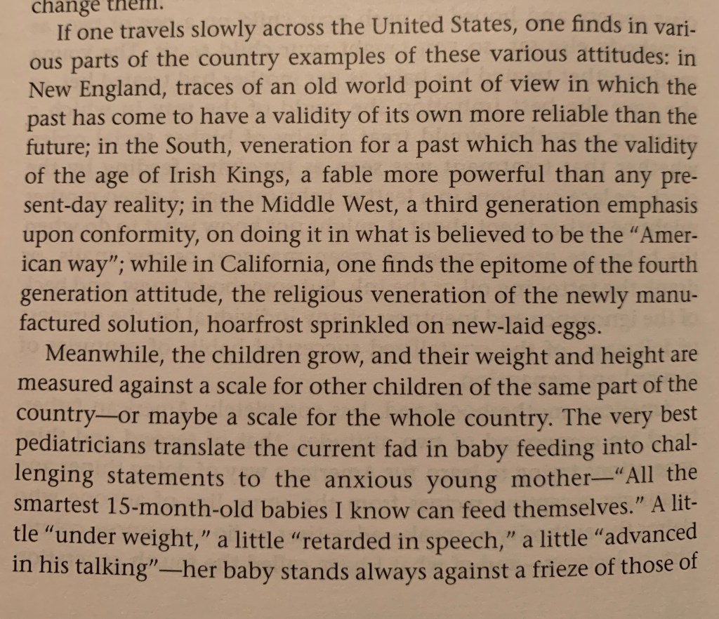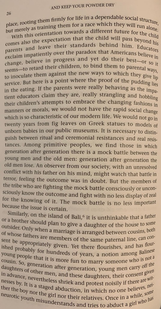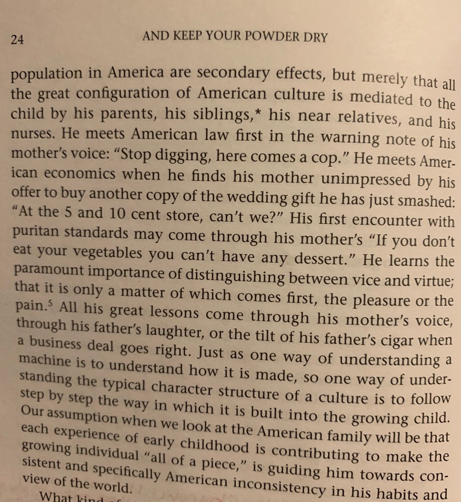 The remainder of Chapter VIII of And Keep Your Powder Dry is absolutely fascinating. Margaret Mead discusses the formation of the conscience, the American experience of adolescence, and how they form America’s drive toward Progress.
