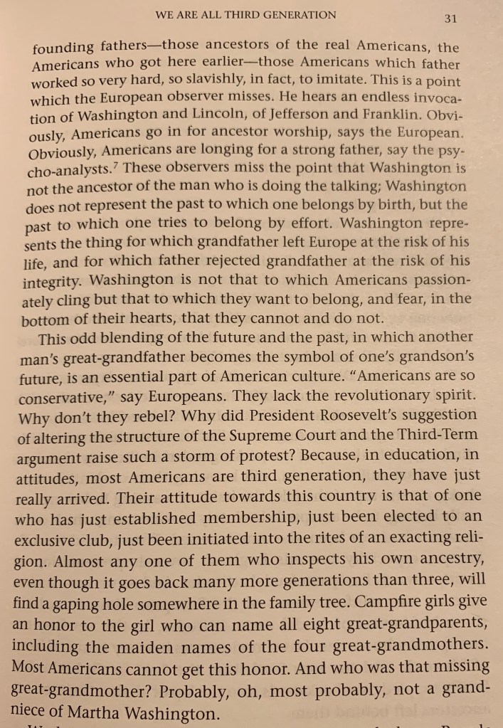 Adoration of Washington isn’t an attempt to hold onto a past; he’s a symbol of what we, as an individual in America, can achieve here. I love this explanation, as well, for why a nation of revolutionaries doesn’t really revolt. If we take on the characteristics of the third-generation American, she explains, our place as Americans finally feels certain. We won’t be deported. Our parents won’t be deported. We know the rules. Everything’s cool. We don’t revolt, because don’t want to lose our place. This place.