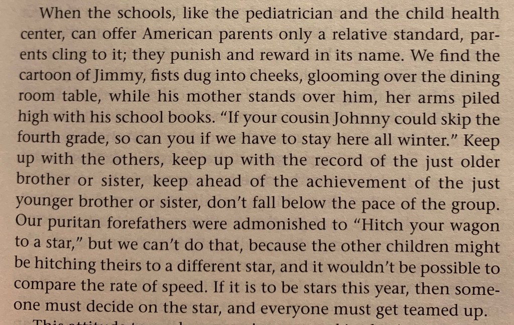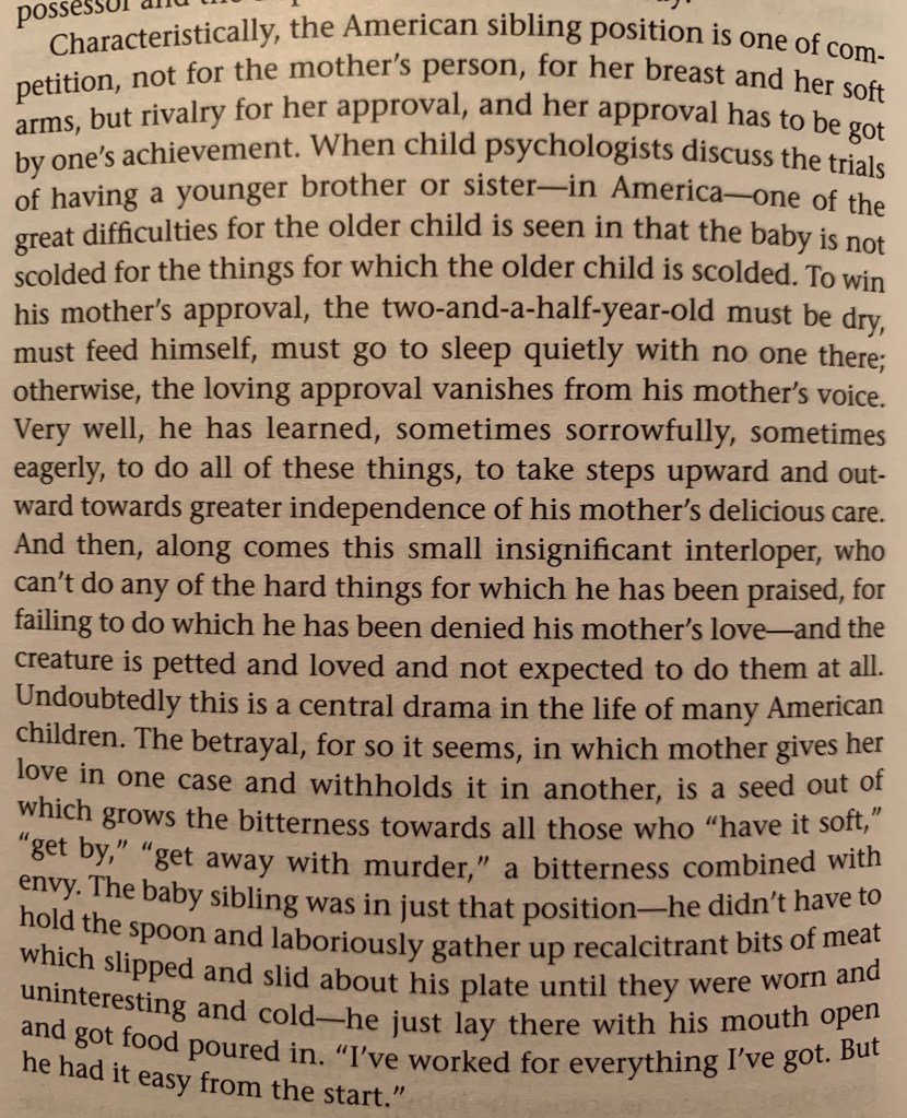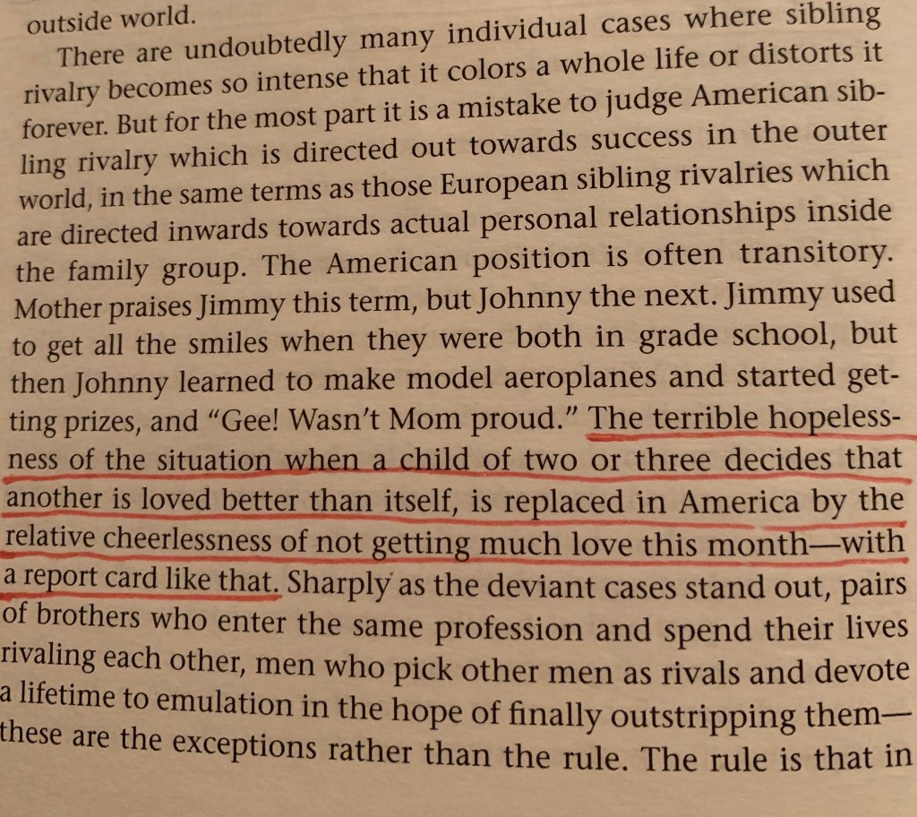 Finally, Mead explains how our parenting toward success creates a sibling rivalry that can look bitter, but is transitory, so not hopeless. I’m mostly including it, because it’s Mead, like so much in this chapter, in fine form.