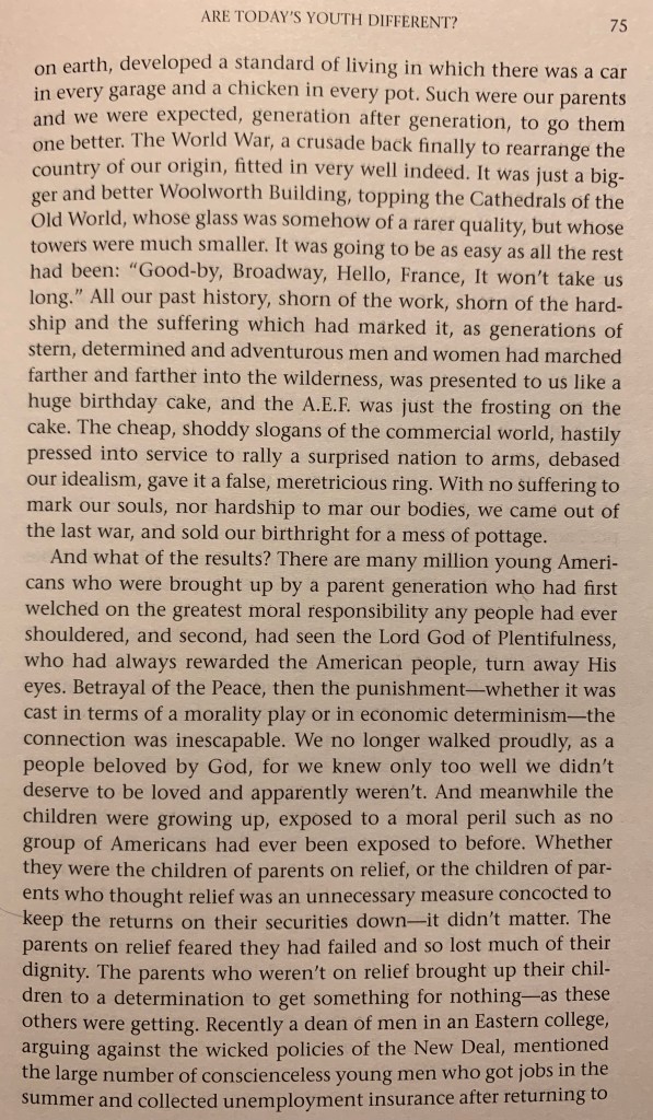 “As long as youth argues as to whether one ought or ought not to have ideals, or to fight for what is right, we may be sure that they have come through, as Americans, through the miasma of twenty-five years of parents who repudiated responsibility.”