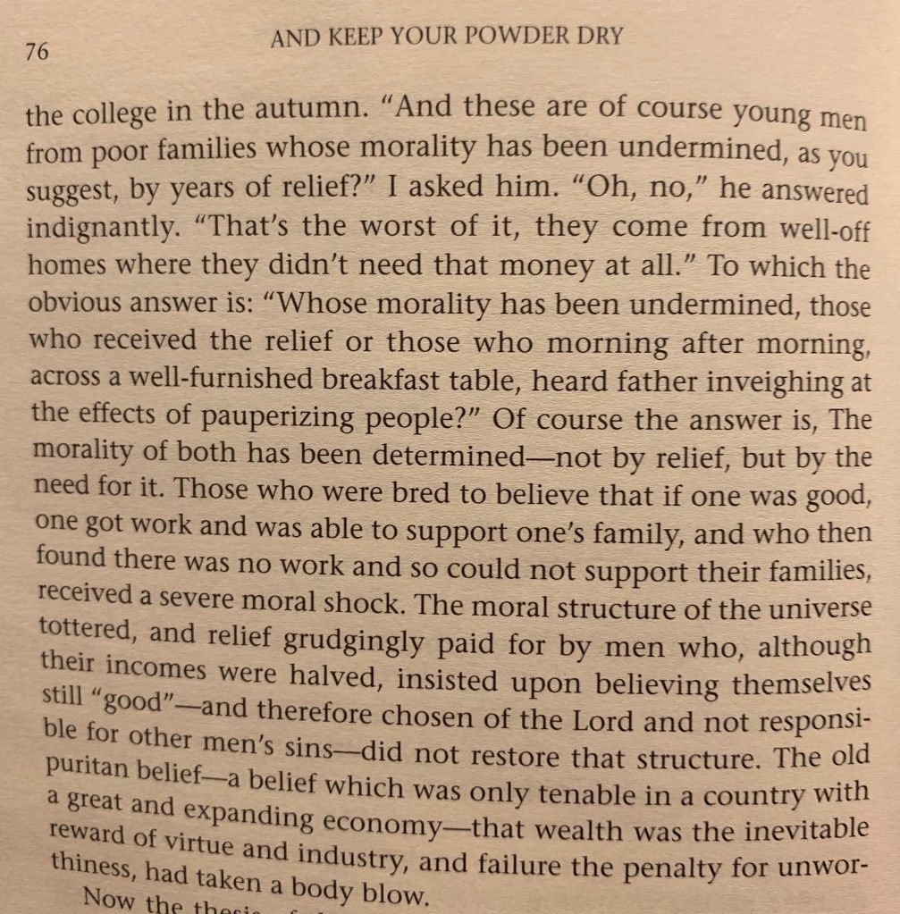 Mead wasn’t considered a conservative as far as I can tell, but calling the New Deal wicked is the sort of description likely to make conservative readers smile and liberal readers scoff. Her description of relief/aid makes it clear that she sees it as contrary to good character. That’s not the whole story of the need for relief, though, and she understands that. One thing I really admire about Mead is how seamlessly she moves from a scathing criticism to obvious understanding of the other side, like in this next passage.
