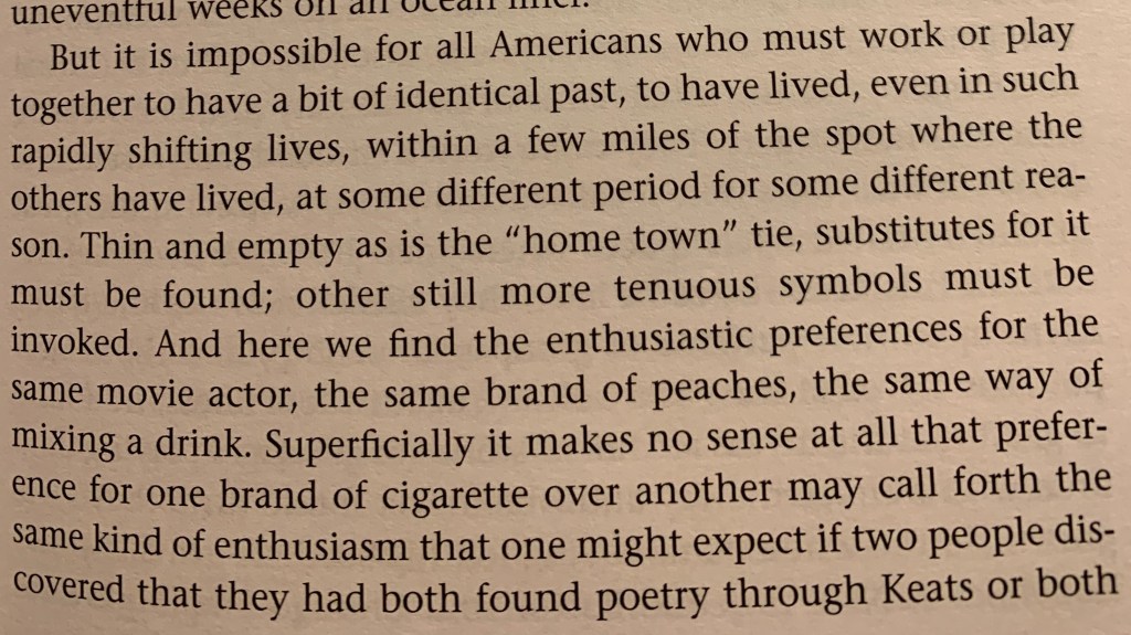 “Superficially it makes no sense at all that preference for one brand of cigarette over another may call forth the same kind of enthusiasm that one might expect if two people discovered that they had both found poetry through Keats…”