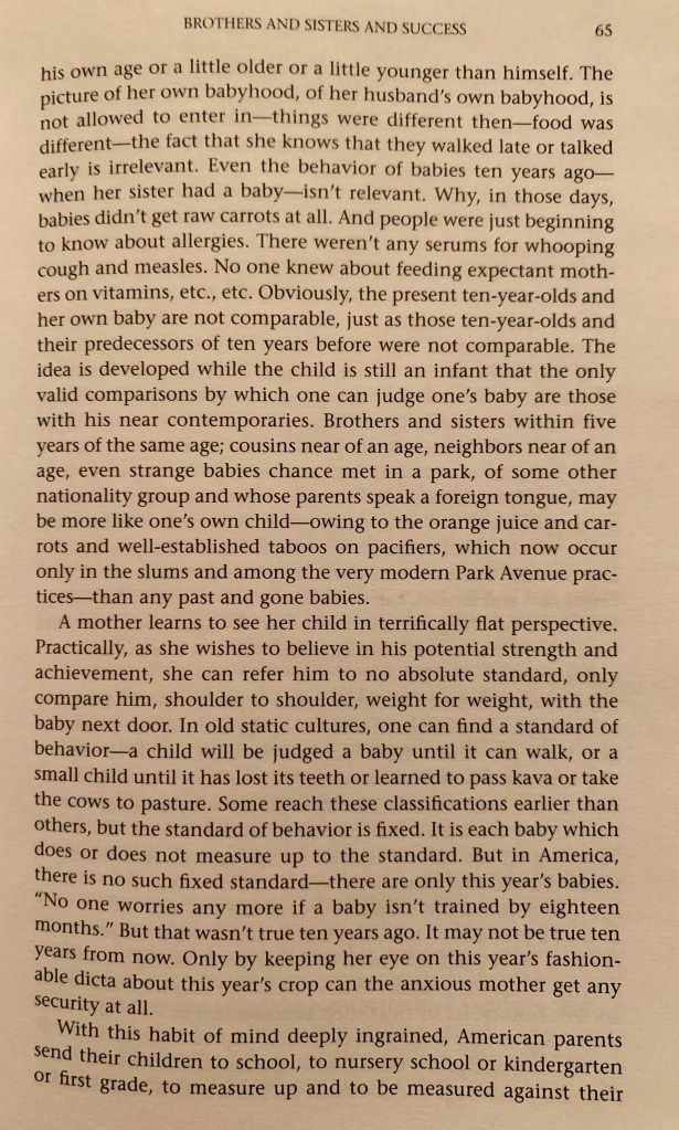 Oh, she makes me laugh as she explains some important things. In American families, Mead asserts, this focus on comparing kids who are roughly the same age means comparisons of siblings that sets up a particularly American flavor of sibling rivalry. Try to catch the older sister; don’t get outpaced by the younger. The message is one of relentless competition.